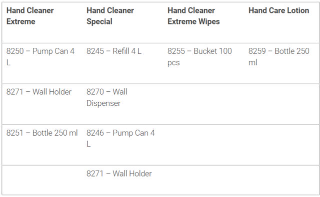 A embalagem foi cuidadosamente pensada. Ambas as versões são fornecidas em embalagens práticas, como garrafas que podem ser montadas na parede à altura de trabalho, um dispensador de parede económico e garrafas pequenas e práticas.
